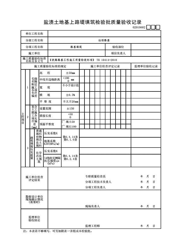 表格名称:02010602 盐渍土地基上路堤填筑检验批质量验收记录