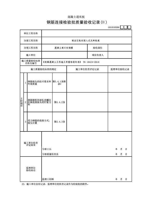 表格名称:G01010506 【混凝土道床板】钢筋连接检验批质量验收记录(Ⅱ)