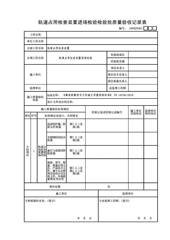 表格名称:G08020401 轨道占用检查装置进场检验检验批质量验收记录表