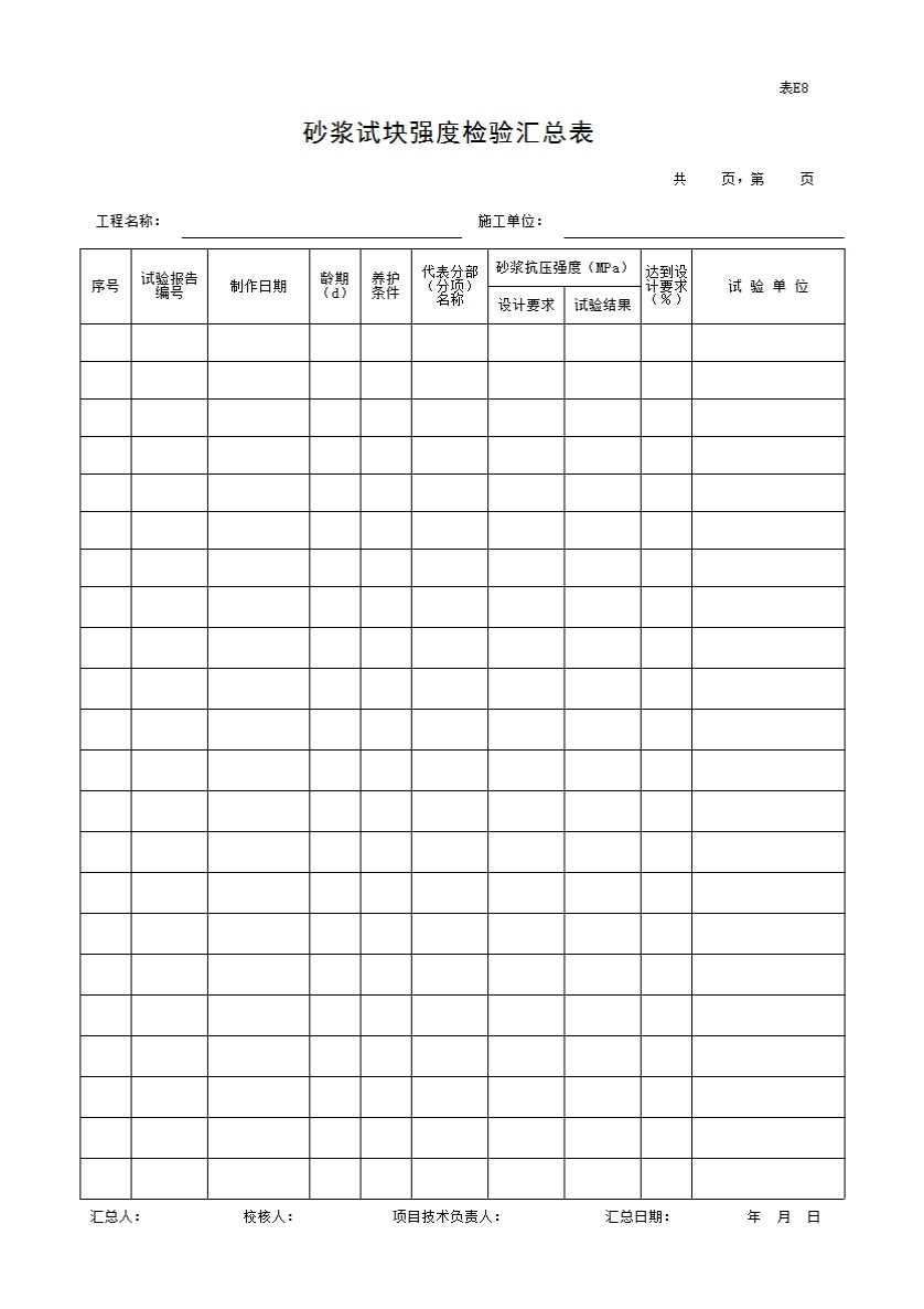 表格名称:表E8 砂浆试块强度检验汇总表