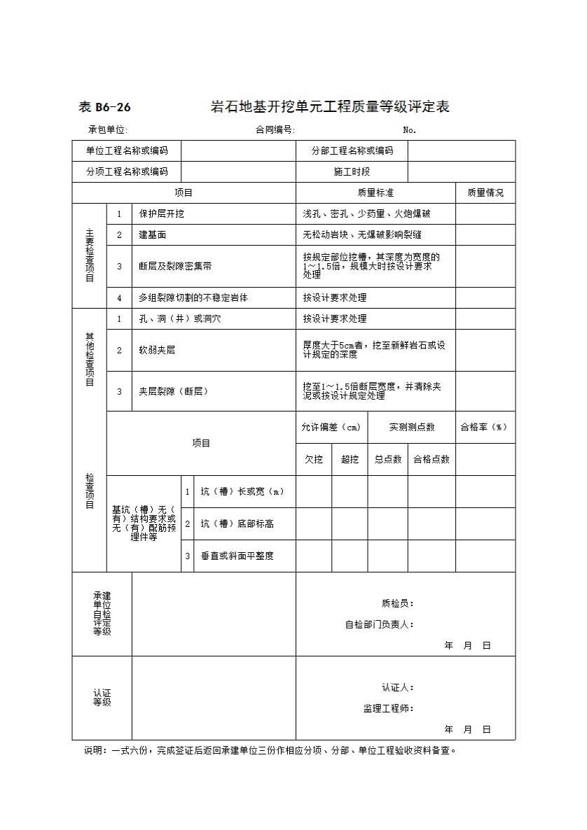 表格名称:表B6-26岩石地基开挖单元工程质量等级评定表