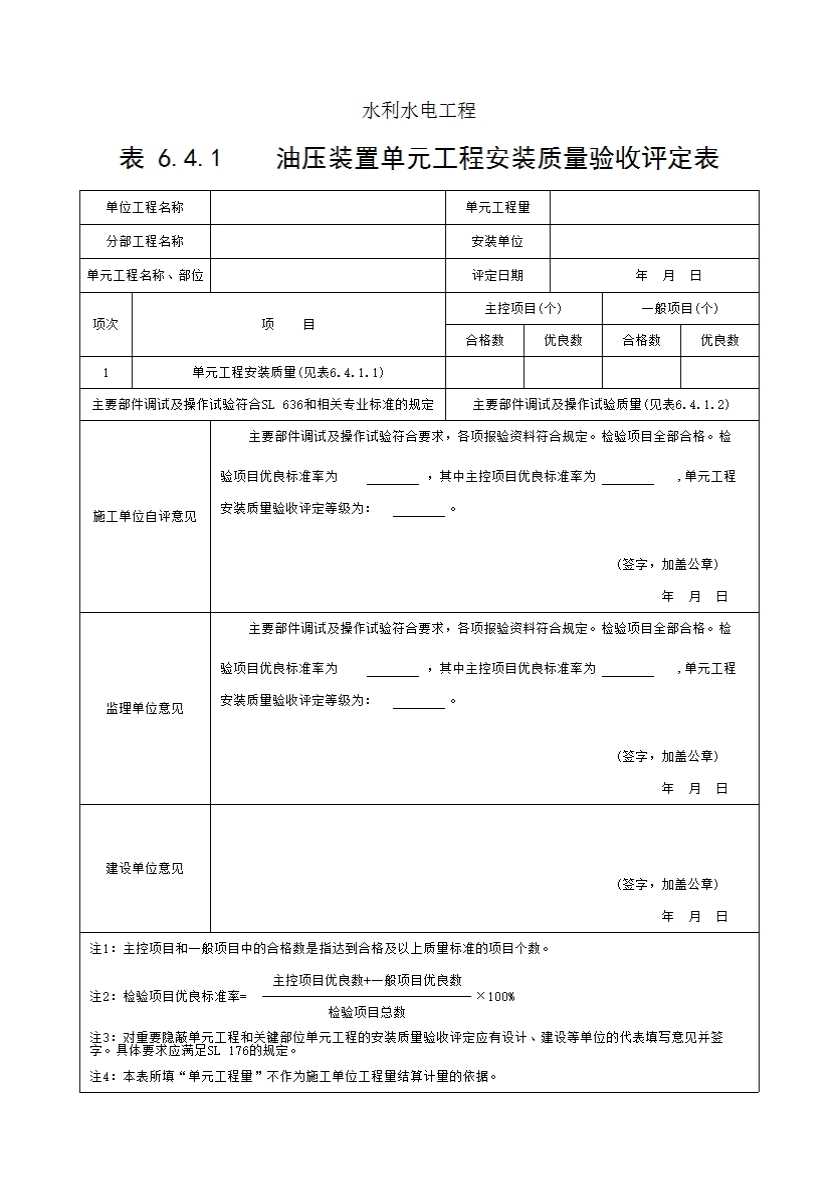 表6.4.1 油压装置单元工程安装质量验收评定表