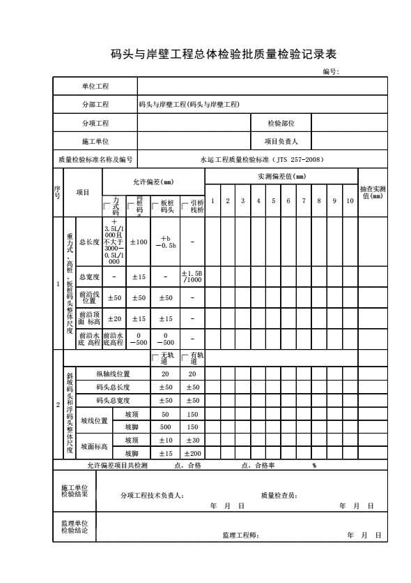 表格名称:码头与岸壁工程总体检验批质量检验记录表