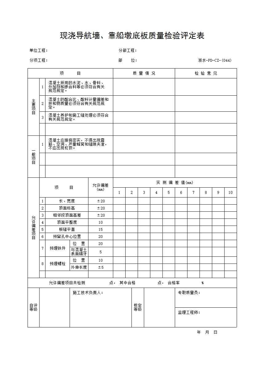 表格名称:044 现浇导航墙、靠船墩底板质量检验评定表
