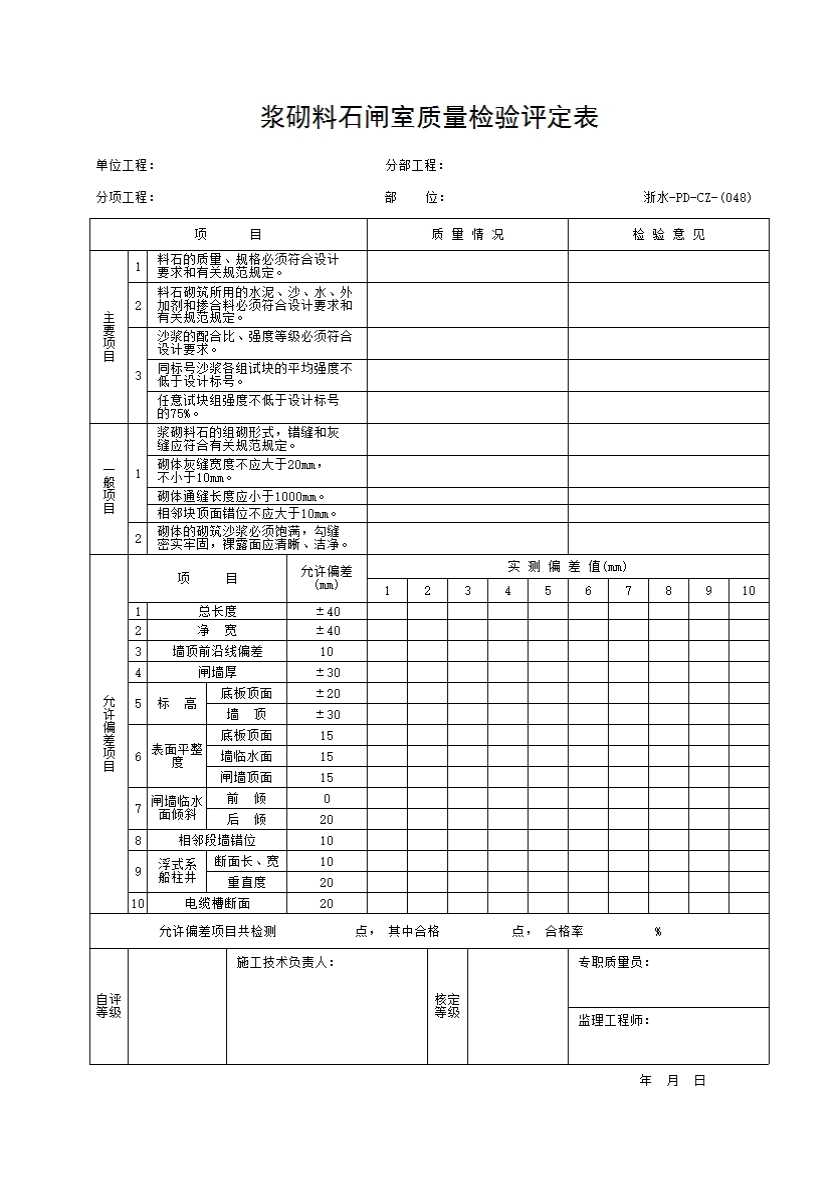 表格名称:048 浆砌料石闸室质量检验评定表
