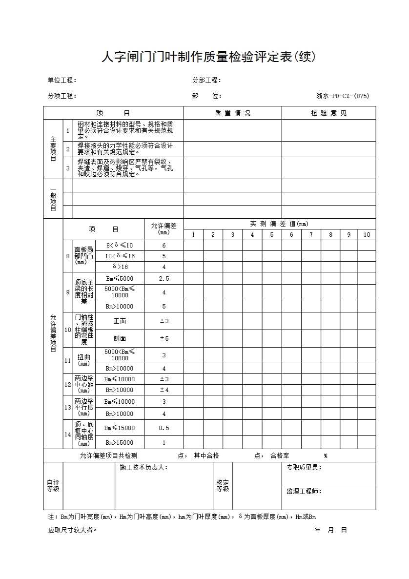 表格名称:075 人字闸门门叶制作质量检验评定表(续)