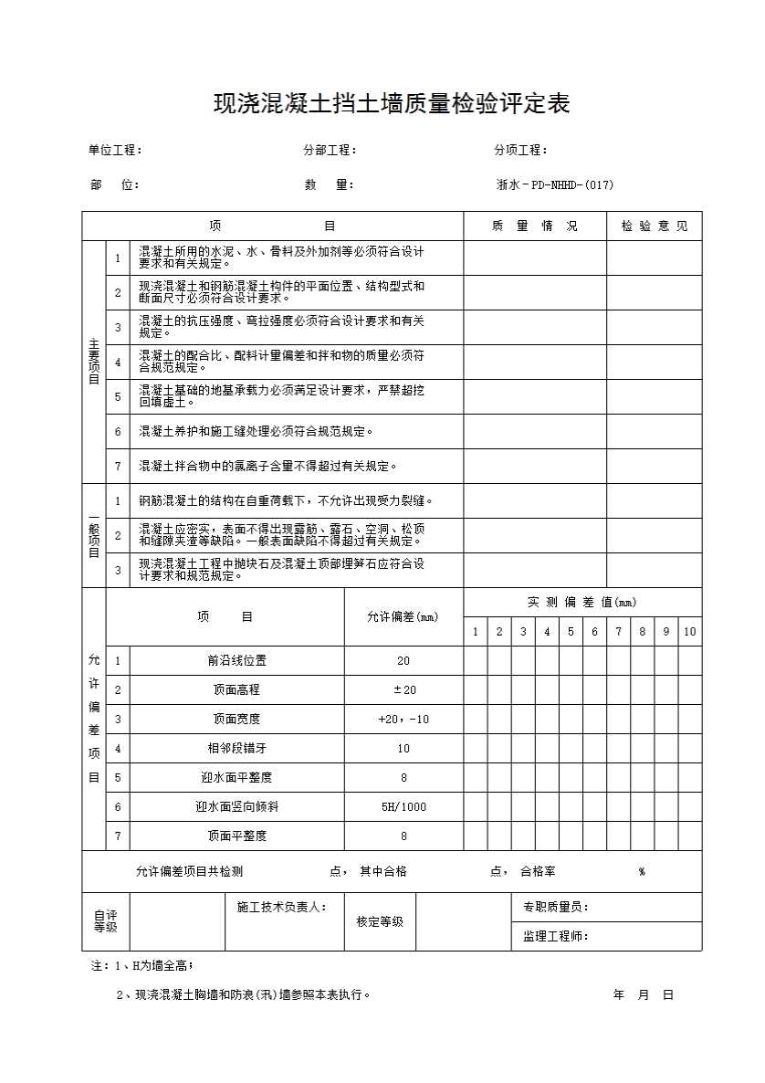 表格名称:017 现浇混凝土挡土墙质量检验评定表
