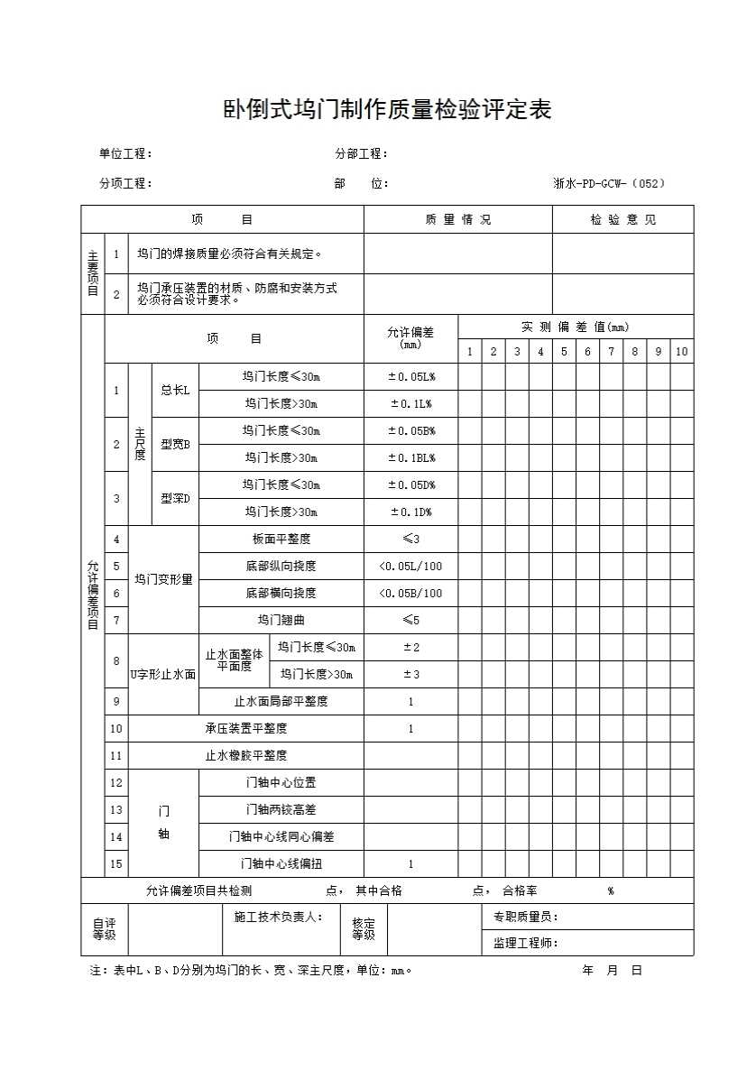 表格名称:052 卧倒式坞门制作质量检验评定表