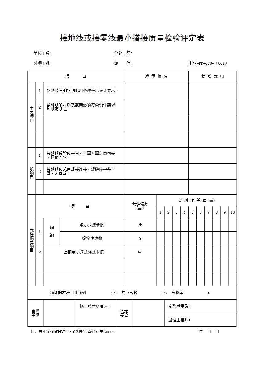 表格名称:066 接地线或接零线最小搭接质量检验评定表