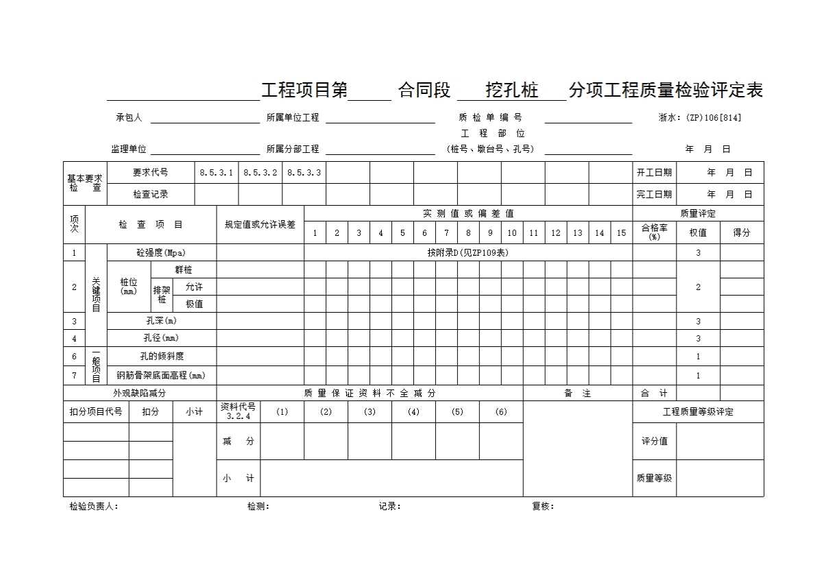 表格名称:014 挖孔桩分项工程质量检验评定表