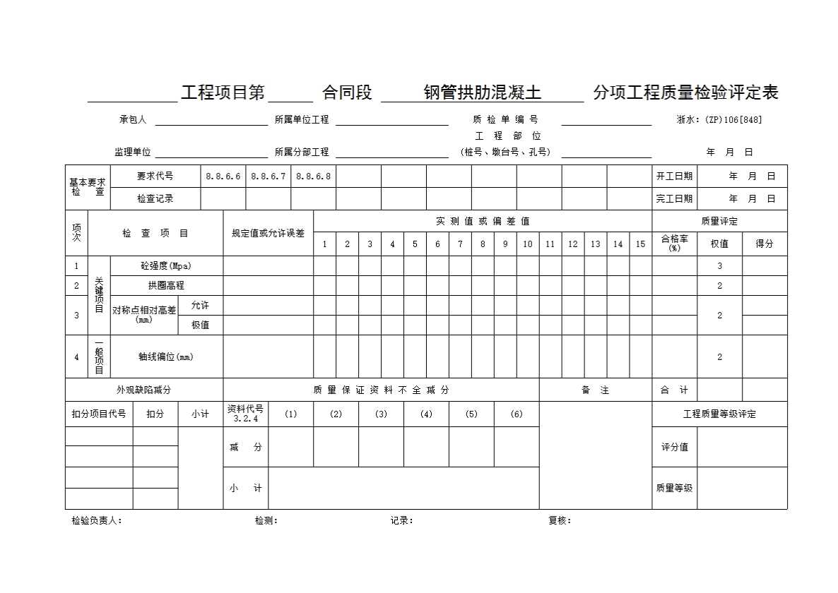 表格名称:048 钢管拱肋混凝土分项工程质量检验评定表