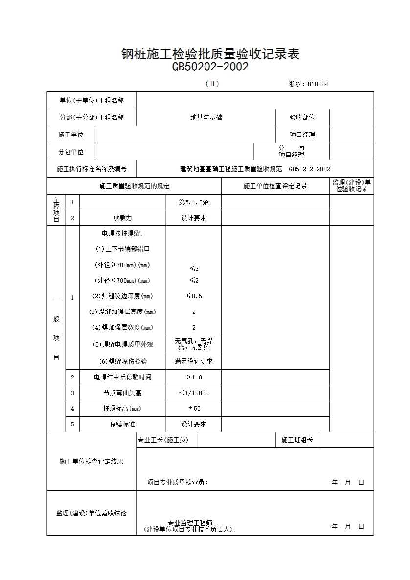 表格名称:030 钢桩施工检验批质量验收记录表(II)