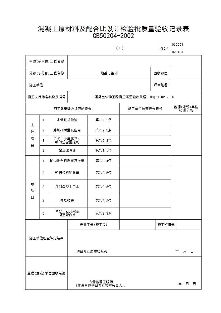 表格名称:053 混凝土原材料及配合比设计检验批质量验收记录表(I)