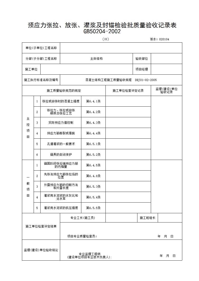表格名称:057 预应力张拉、放张、灌浆及封锚检验批质量验收记录表(III)
