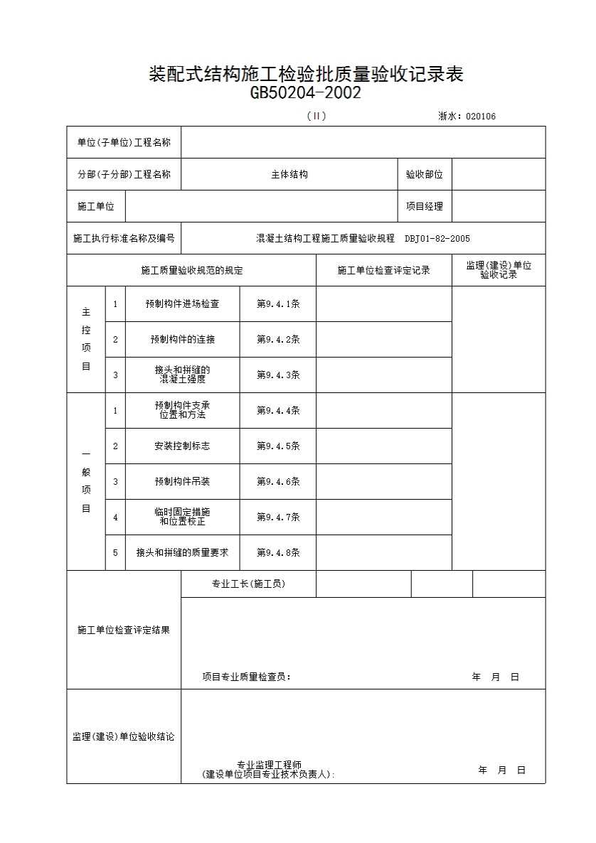 表格名称:061 装配式结构施工检验批质量验收记录表(II)