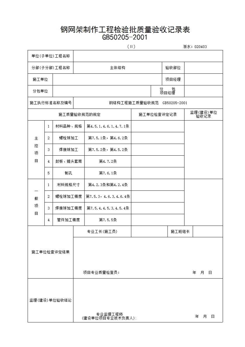 表格名称:074 钢网架制作工程检验批质量验收记录表(II)