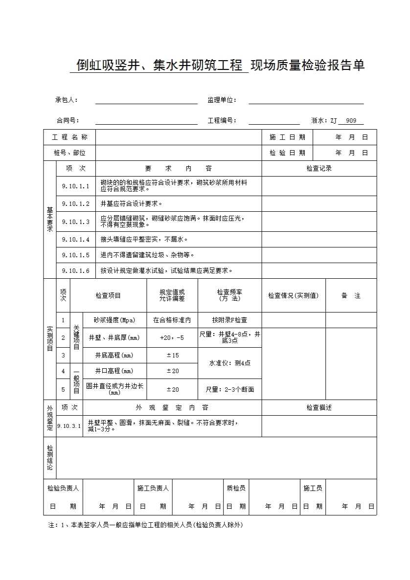 表格名称:浙水:ZJ909 倒虹吸竖井、集水井砌筑工程现场质量检验报告单