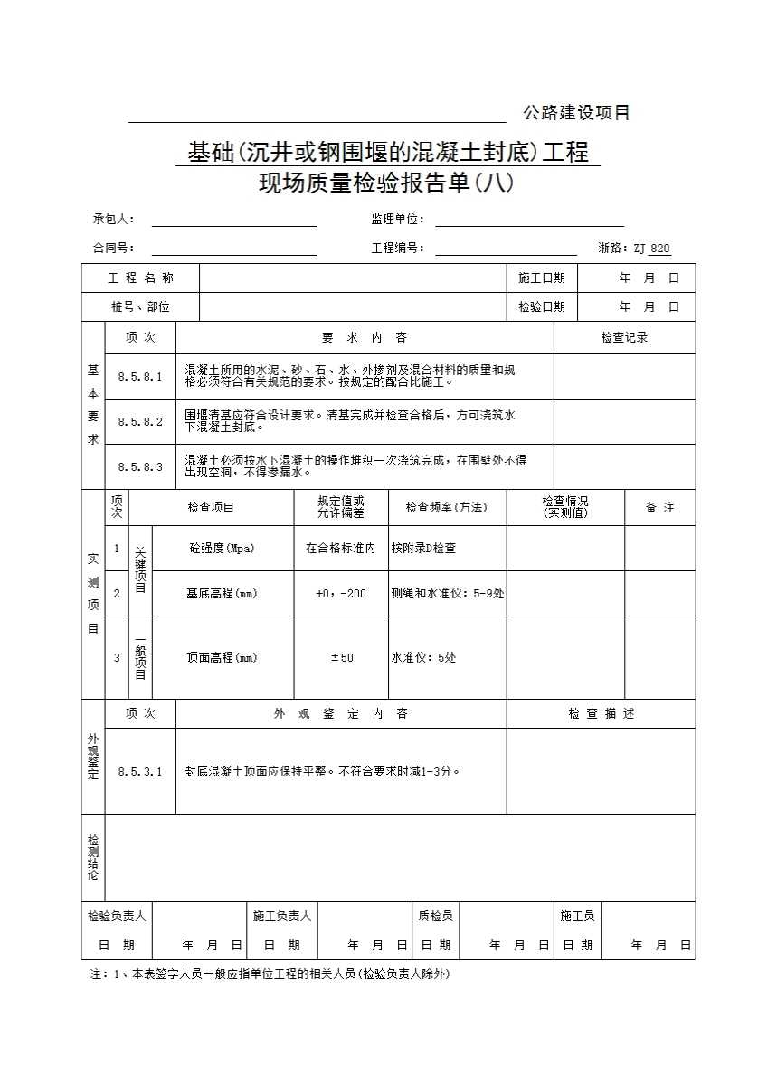 表格名称:浙路ZJ820 基础(沉井或钢围堰的混凝土封底)工程现场质量检验报告单(八)