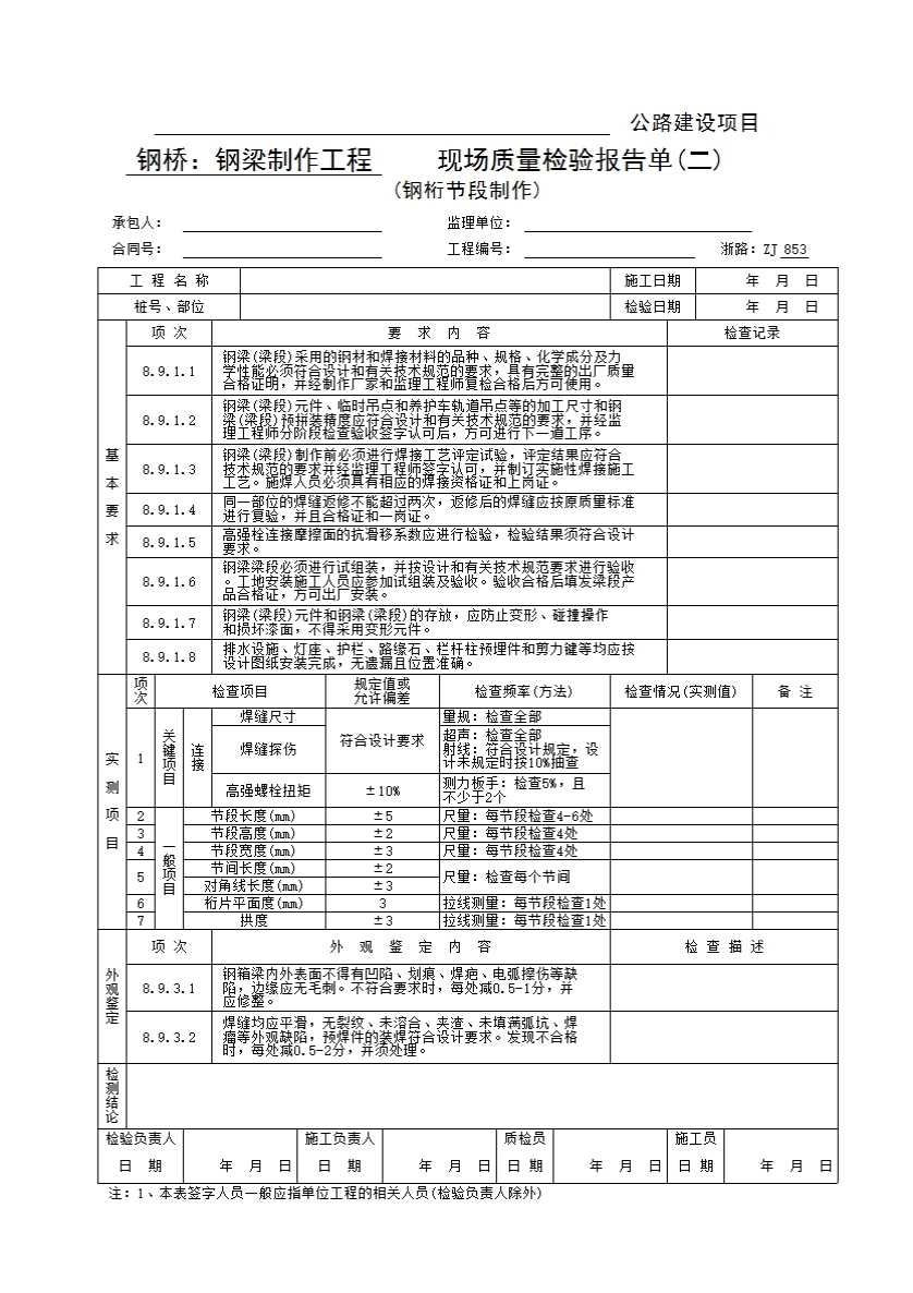浙路ZJ853 钢桥:钢梁制作工程现场质量检验报告单(二)