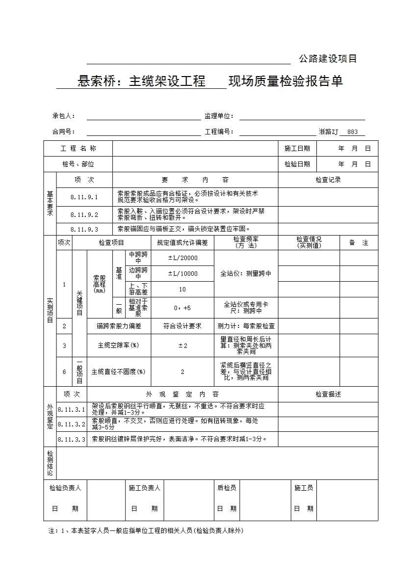 表格名称:浙路ZJ883 悬索桥:主缆架设工程现场质量检验报告单