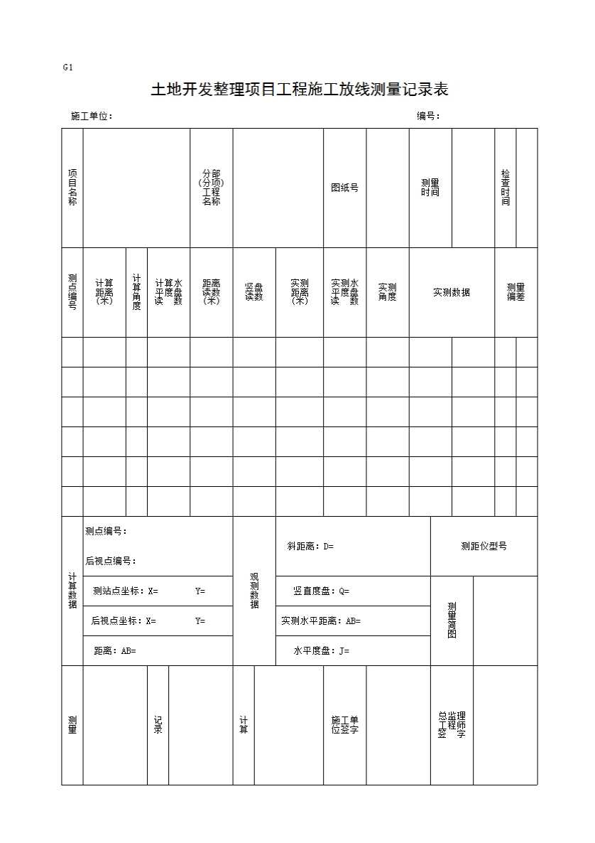表格名称:G1 土地开发整理项目工程施工放线测量记录表