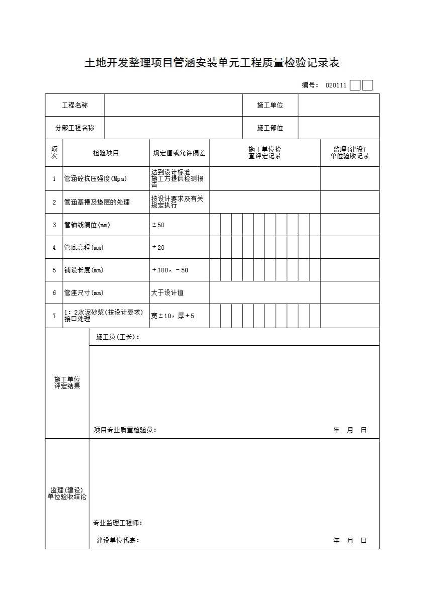 表格名称:土地开发整理项目管涵安装单元工程质量检验记录表
