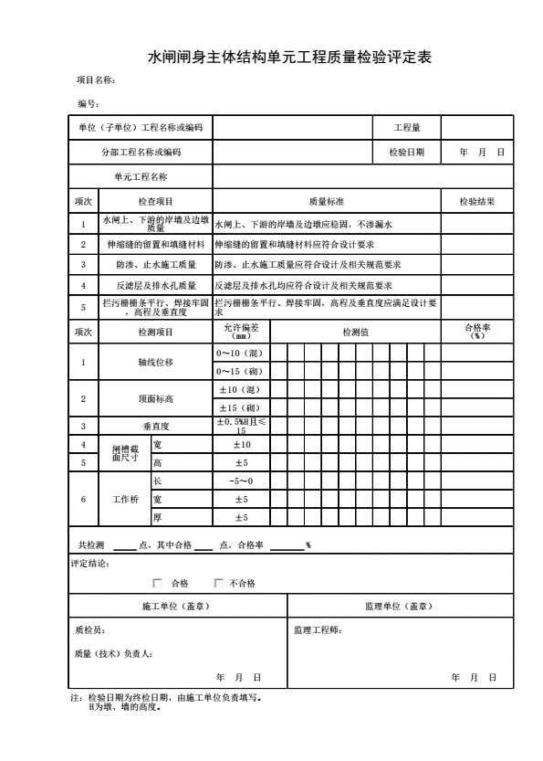 水闸闸身主体结构单元工程质量检验评定表