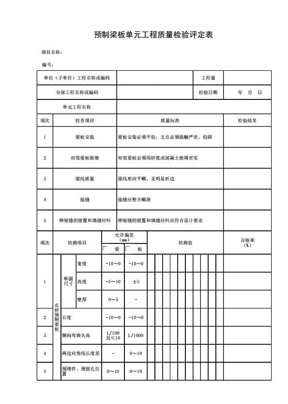 预制梁板单元工程质量检验评定表