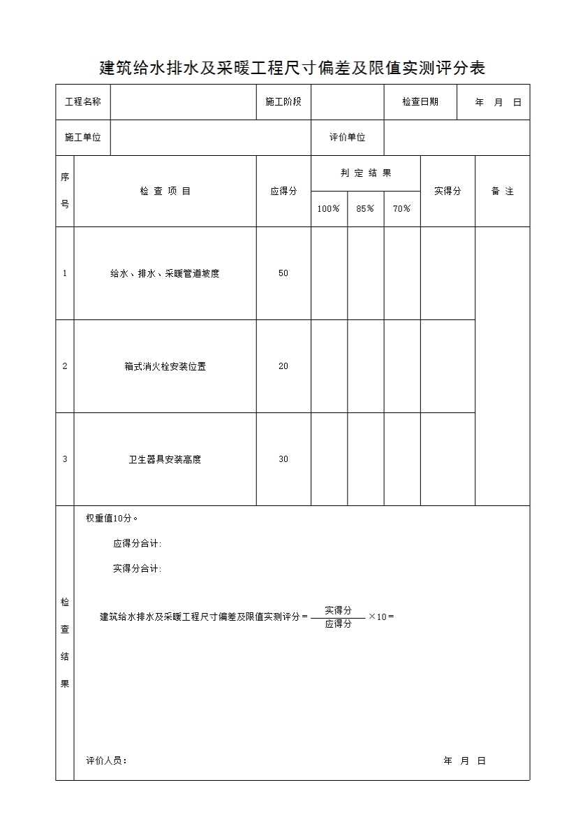 建筑给水排水及采暖工程尺寸偏差及限值实测评分表