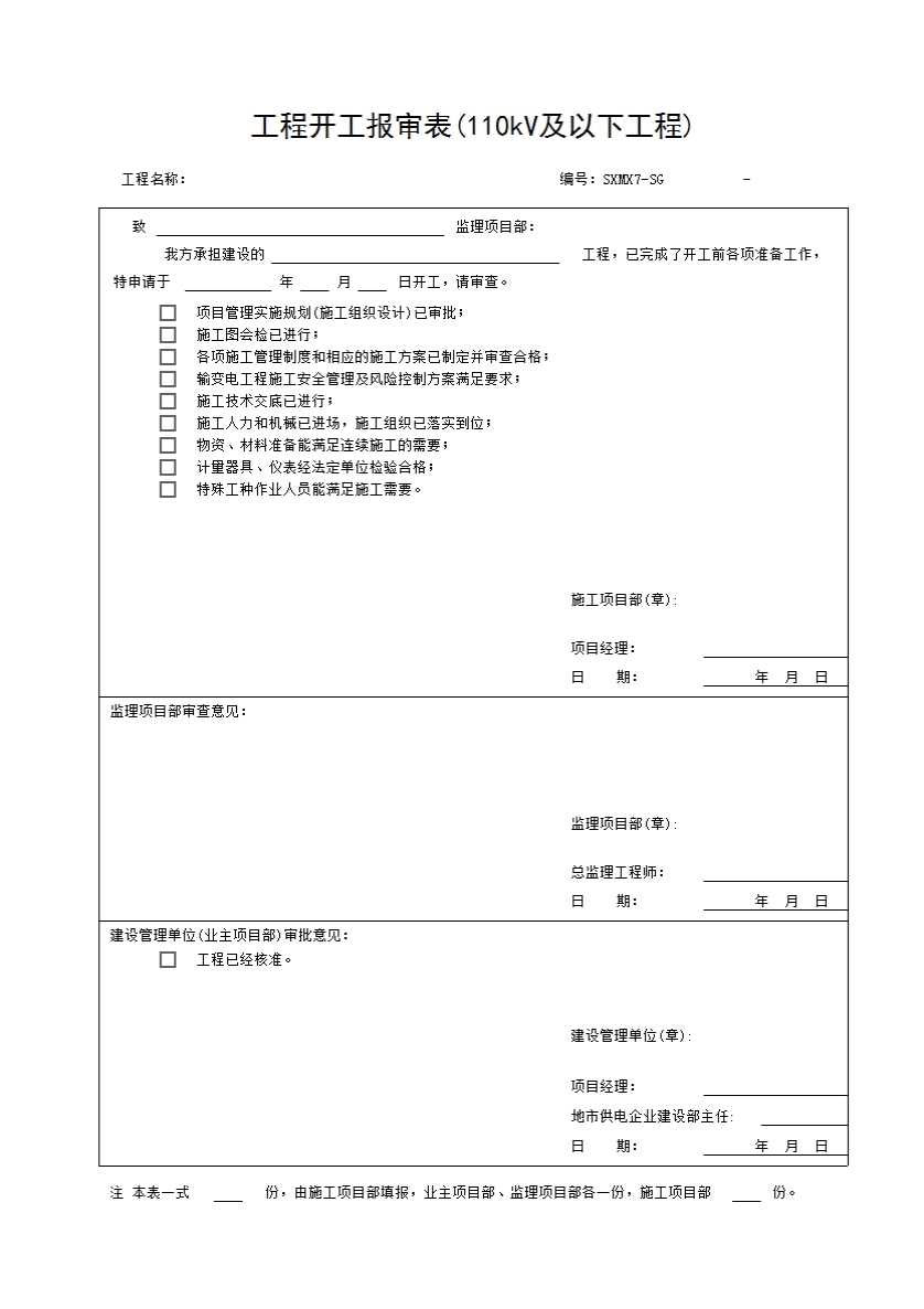 表格名称:工程开工报审表(110kV及以下工程)