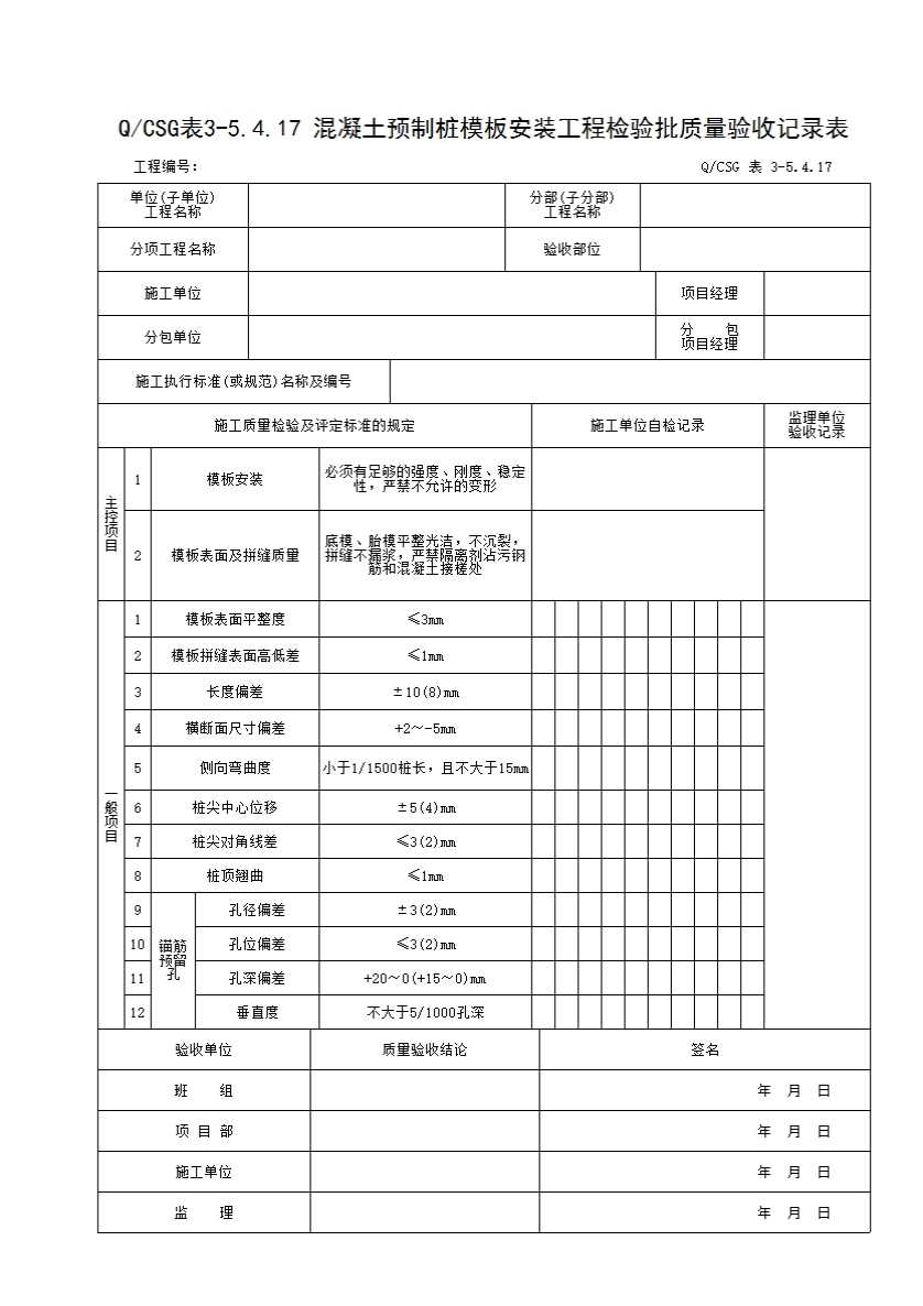 表格名称:QCSG 表 3-5.4.17 混凝土预制桩模板安装工程检验批质量验收记录表