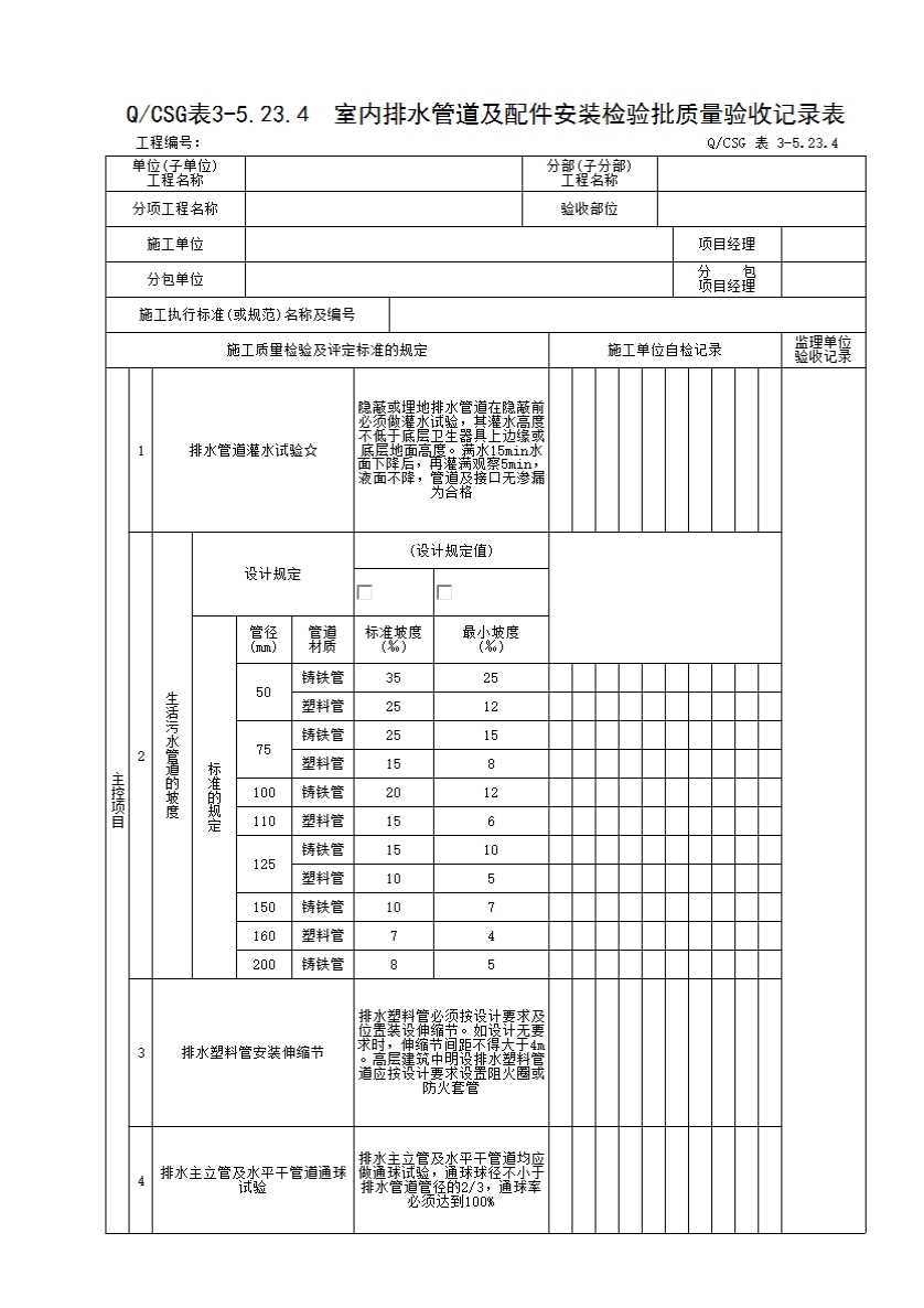 QCSG 表 3-5.23.4 室内排水管道及配件安装检验批质量验收记录表