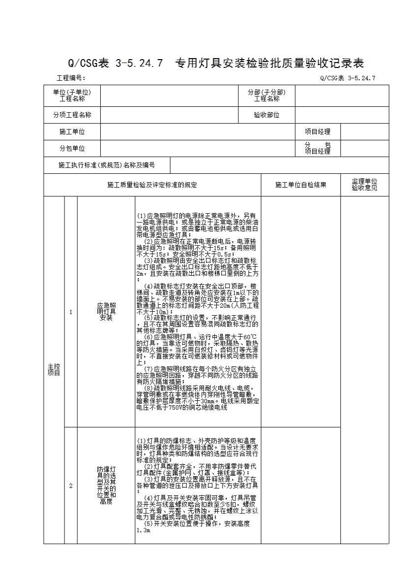 QCSG 表 3-5.24.7 专用灯具安装检验批质量验收记录表
