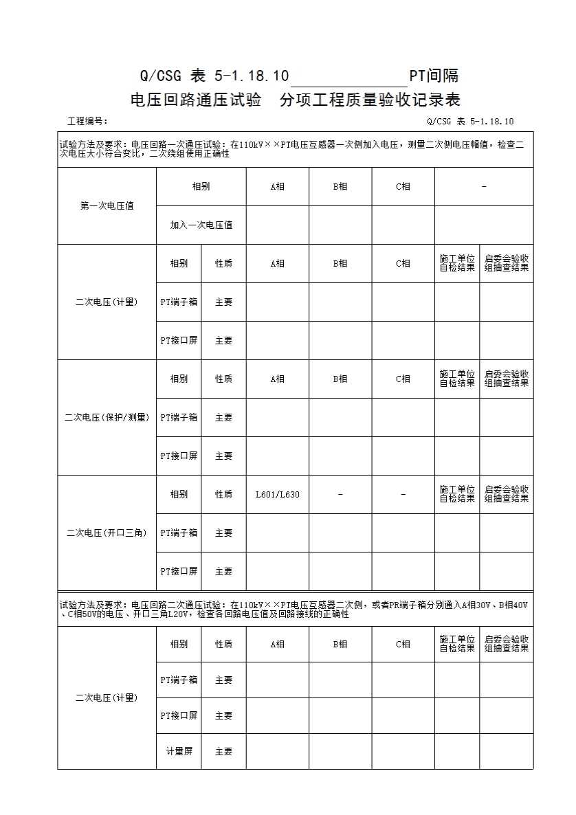 表格名称:QCSG 表 5-1.18.10 ______PT间隔电压回路通压试验 分项工程质量验收记录表