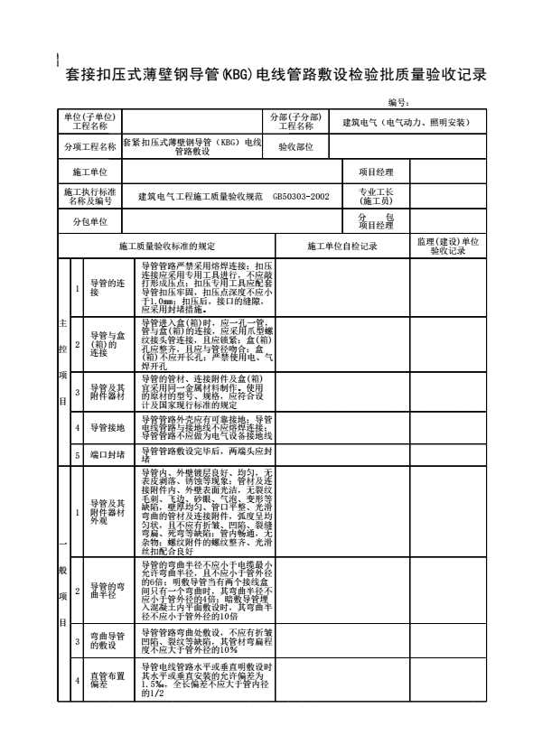 表格名称:套接扣压式薄壁钢导管(KBG)电线管路敷设检验批质量验收记录
