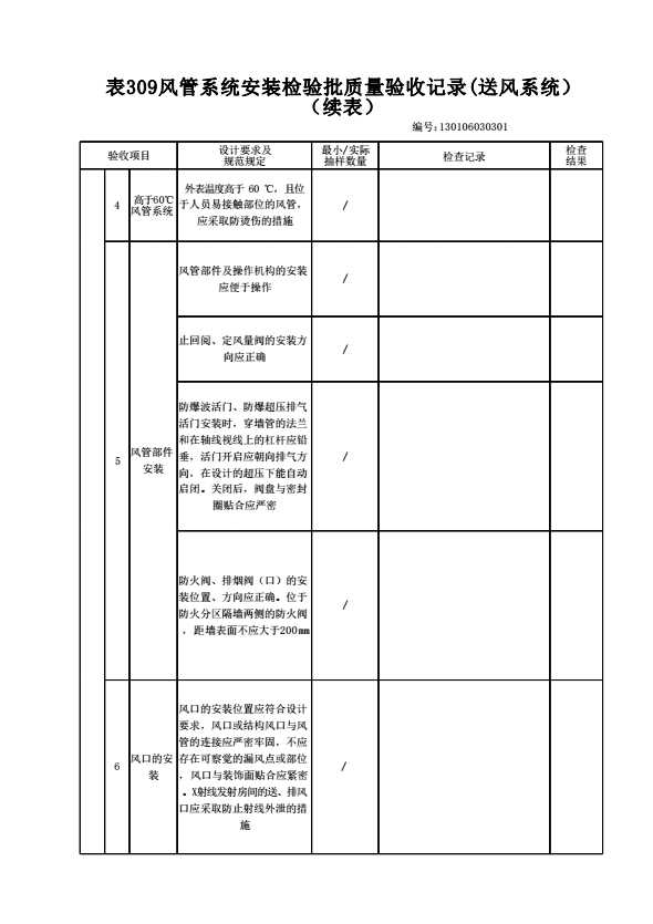 表格名称:130106030301 风管系统安装检验批质量验收记录(送风系统)