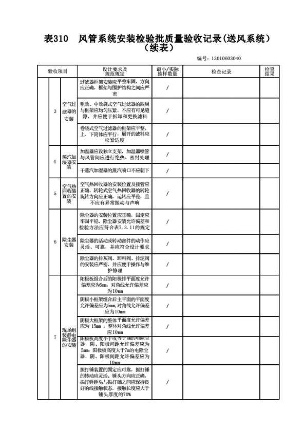 表格名称:130106030401 风机与空气处理设备安装检验批质量验收记录