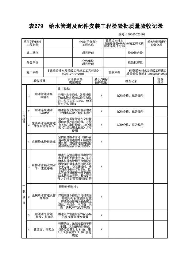 表格名称:130305020101 给水管道及配件安装工程检验批质量验收记录