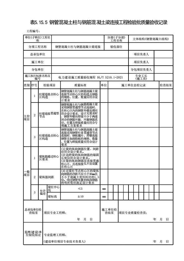 表格名称:表5.15.5 钢管混凝土柱与钢筋混凝土梁连接工程检验批质量验收记录
