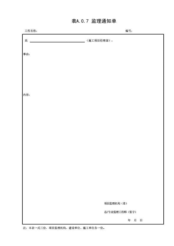 表格名称:表A.0.7 监理通知单