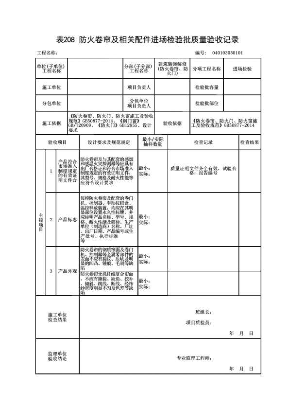 表格名称:040103050101 防火卷帘及相关配件进场检验批质量验收记录
