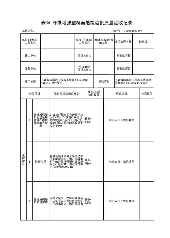 表格名称:100301061307 纤维增强塑料面层检验批质量验收记录