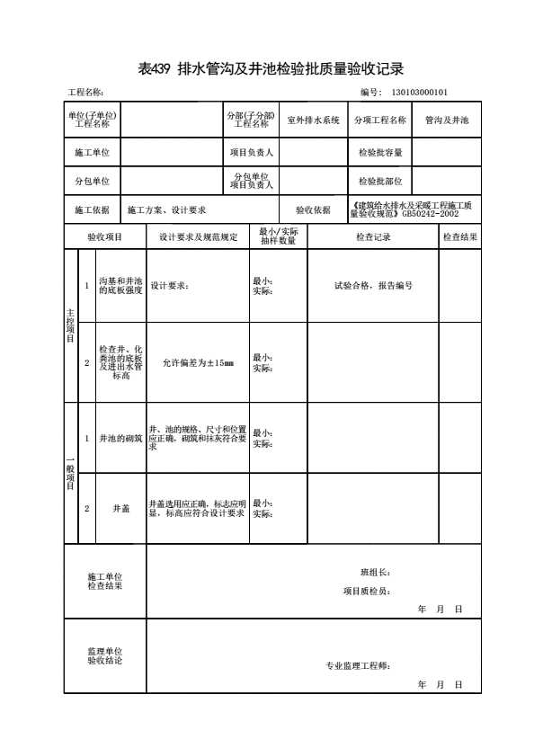 表格名称:130103000101 排水管沟及井池检验批质量验收记录