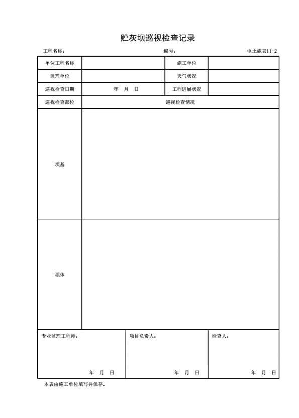 表格名称:电土施表11-2 贮灰坝巡视检查记录