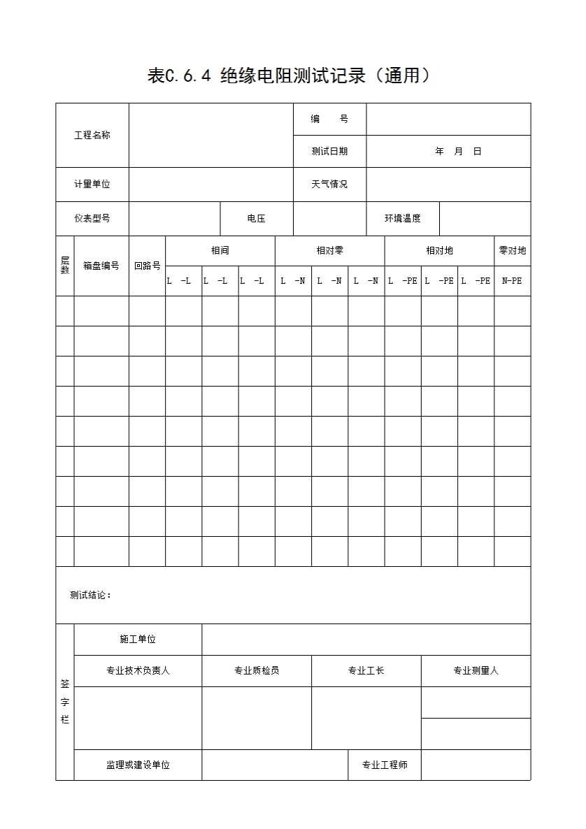 表格名称:表C.6.4 绝缘电阻测试记录(通用)