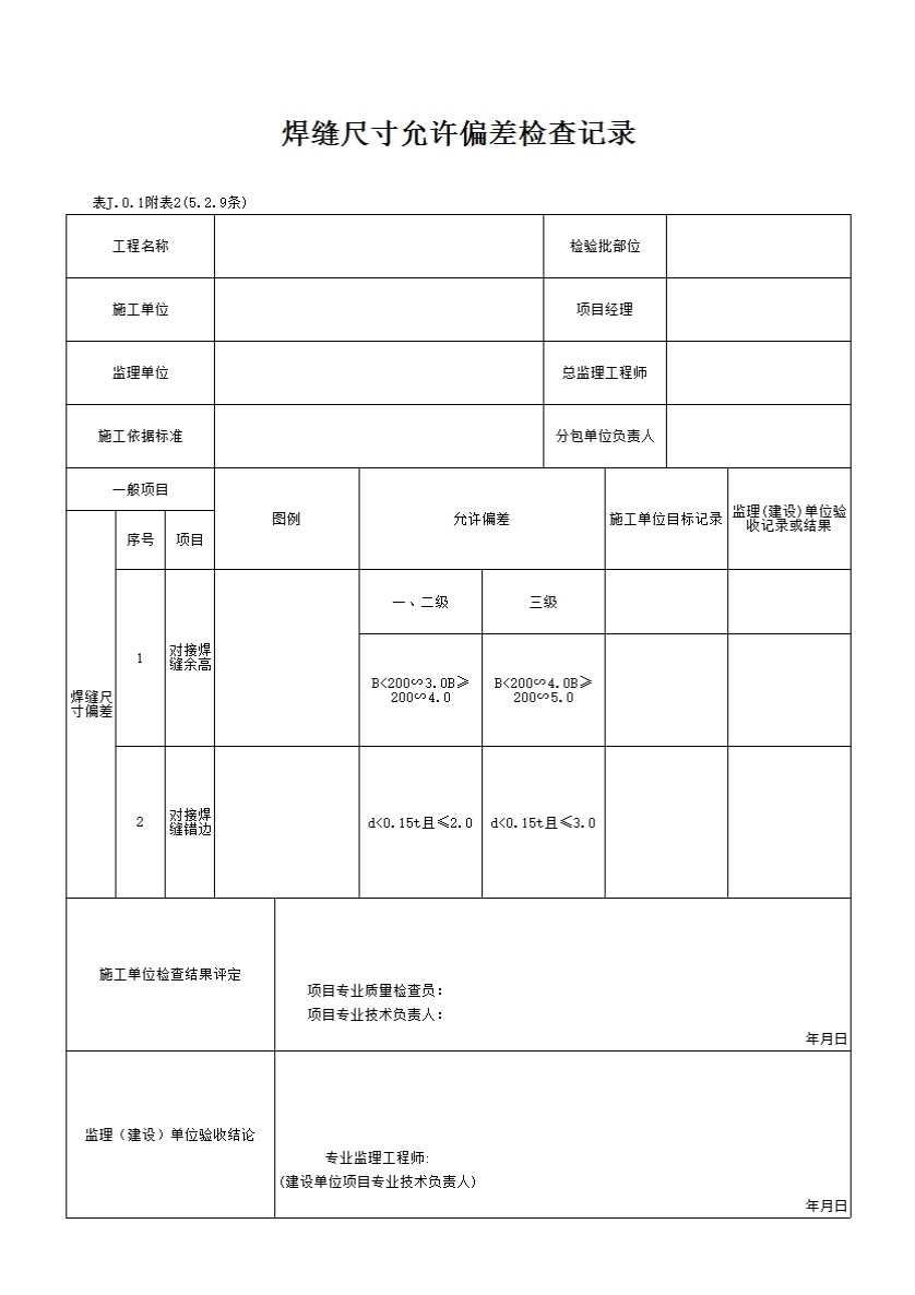 表格名称:焊缝尺寸允许偏差检查记录
