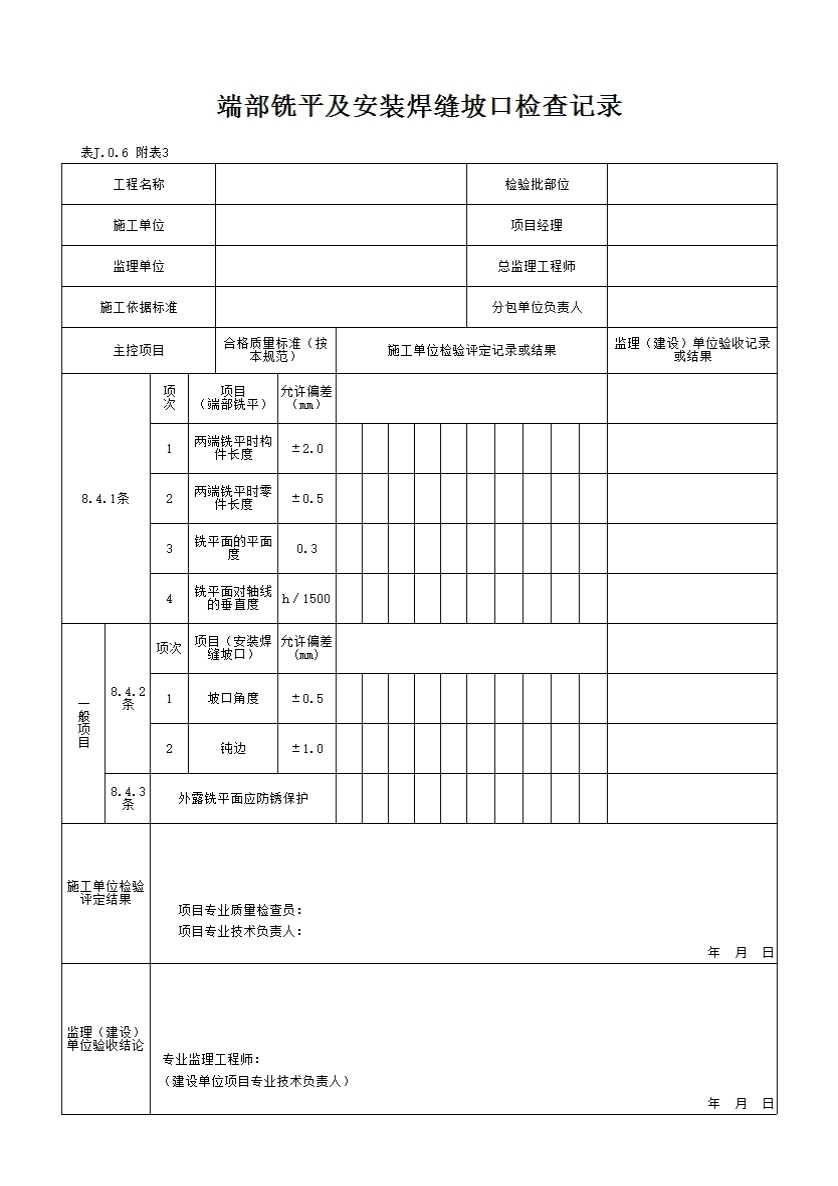 表格名称:端部铣平及安装焊缝坡口检查记录