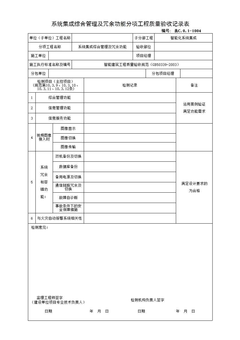 表格名称:C.0.1-1004 系统集成综合管理及冗余功能分项工程质量验收记录表