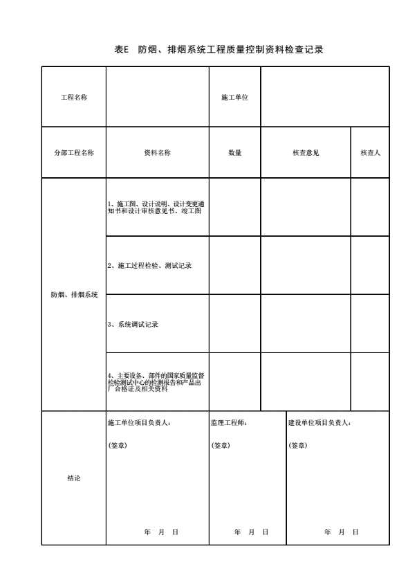 表格名称:附录E 防烟、排烟系统工程质量控制资料检查记录