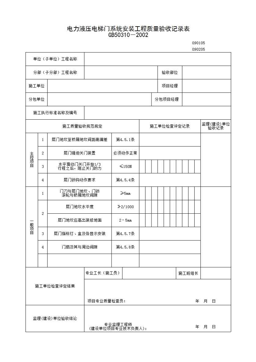 表格名称:电力液压电梯门系统安装工程质量验收记录表
